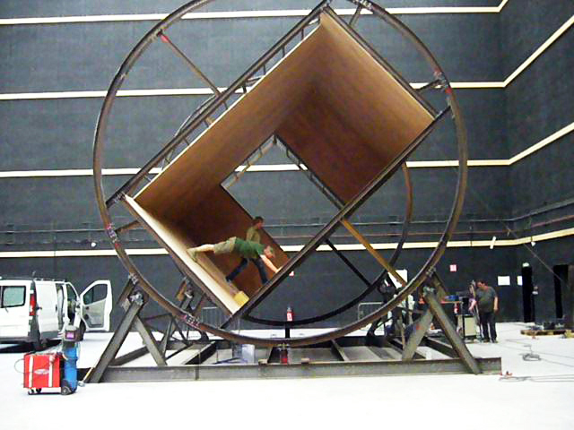 Conception et réalisation d’un élément de décor permettant de donner l’illusion que les comédiens se déplacent avec aisance sur les murs, le sol et le plafond. La caméra étant solidaire du décor, lorsque celui se met à tourner, les comédiens qui se déplacent sur le décor semblent à l’image, ne pas subir la gravité.